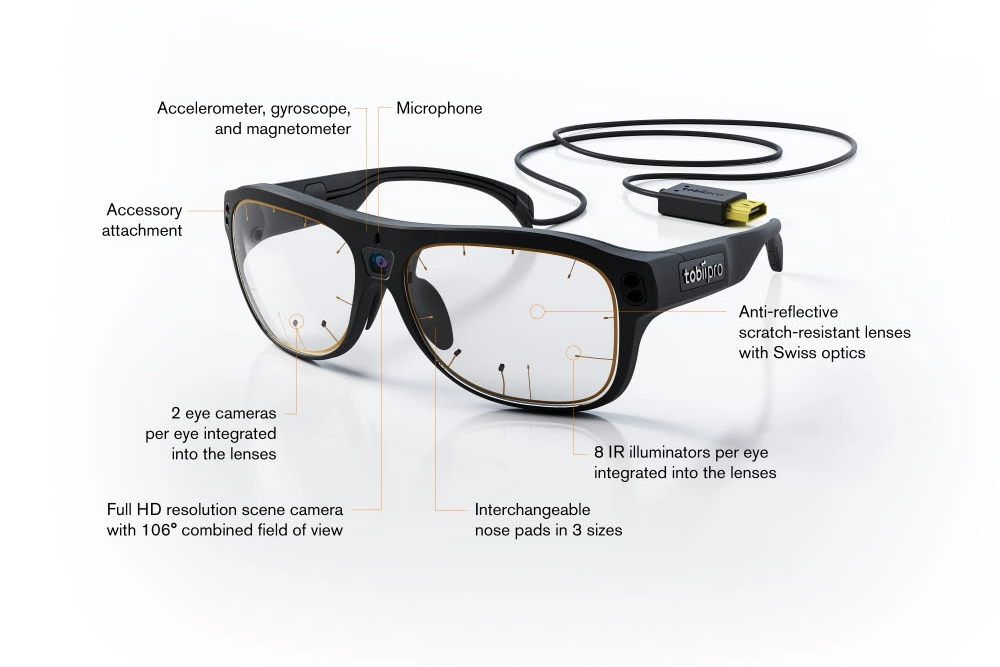อุปกรณ์ติดตามการมองของดวงตาแบบสวมใส่ ที่สามารถนำมาเพื่อการวิจัยเเละวิเคราะห์พฤติกรรมการมองของบุคคล ในสภาพแวดล้อมที่เเท้จริง Tobii Pro Glasses 3 ให้การติดตามการมองของดวงตาที่มีประสิทธิภาพและข้อมูลการมองที่แม่นยำ Tobii Pro Glasses 3 จึงเป็นตัวเลือกที่สำคัญของนักวิจัยทางวิทยาศาสตร์ นักการตลาด นักออกเเบบ เเละผู้ผลิตหลายพันรายทั่วโลก หรือเเม้นกระทั่งผู้ฝึกสอนนักกีฬาบางประเภท ตัวเเว่นขนาดกระทัดรัดจึงทำให้ผู้ใช้สามารถเคลื่อนไหวและโต้ตอบได้อย่างเป็นธรรมชาติ